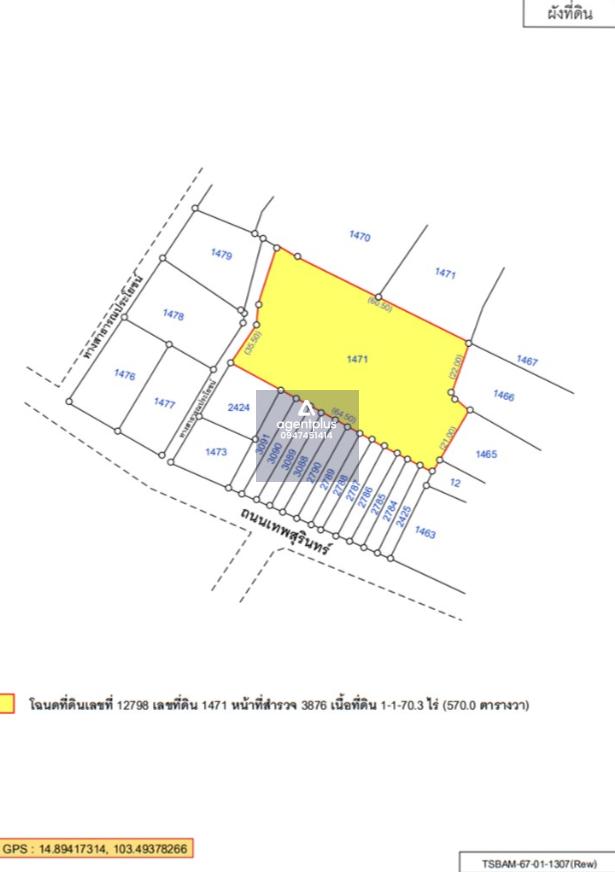 Empty land for sale in Surin, polygonal land shape. The side is next to a public road. Good location, suitable for building a house or doing business.